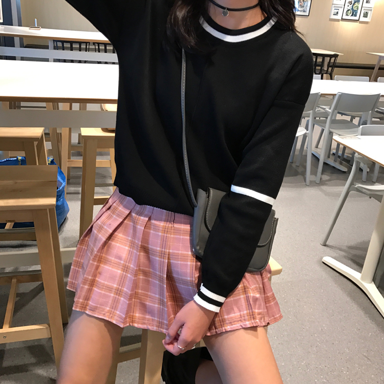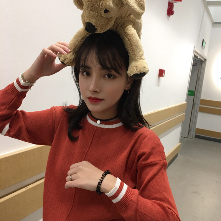 / 韓國學院風秋冬款撞色圓領線條寬松套頭長袖打底衫針織衫女