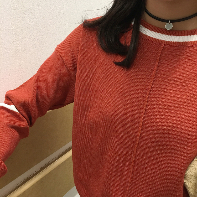 韓國學院風秋冬款撞色圓領線條寬松套頭長袖打底衫針織衫女