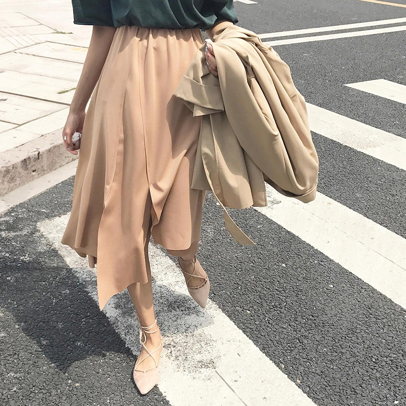 / 復古韓國chic風高腰顯瘦純色不規則半身裙女春秋氣質中長裙