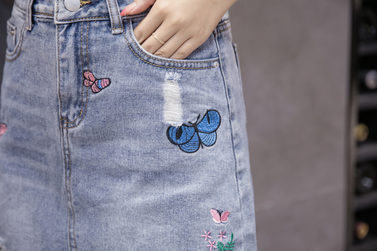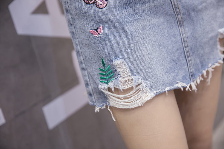 / 韓版高腰破洞牛仔裙半身裙女夏季包臀短裙A字裙刺繡半裙繡花女裙