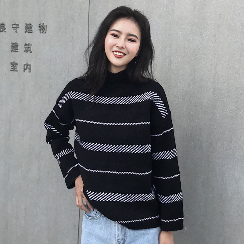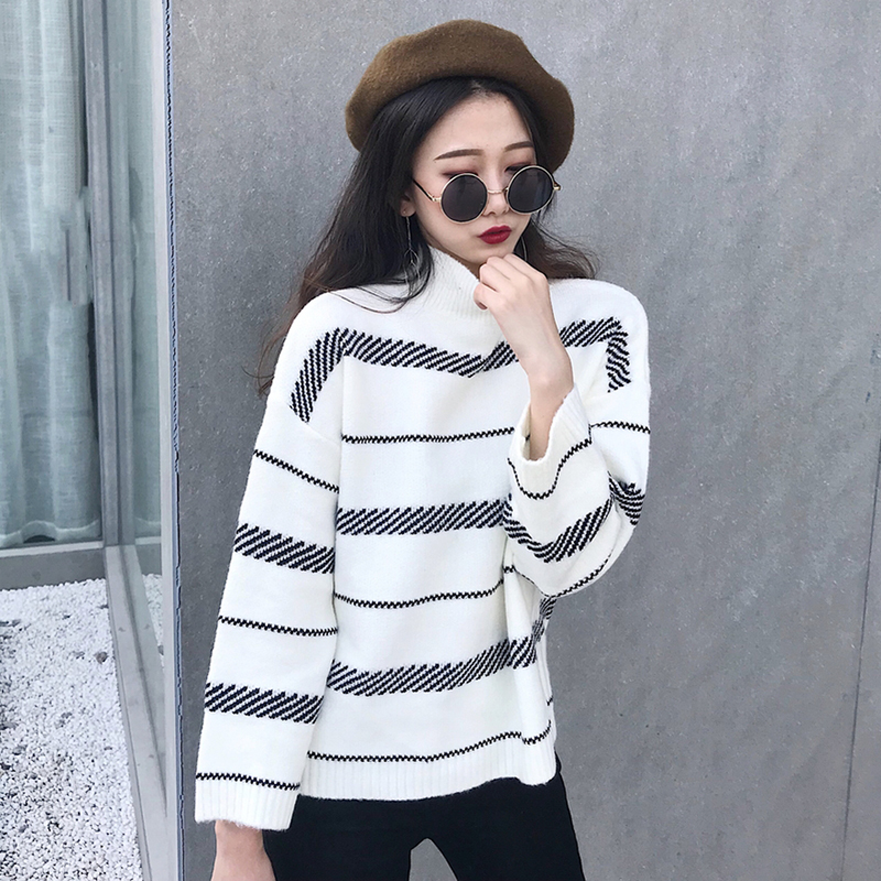 時尚條紋半高領毛衣女秋冬裝2018新款慵懶風寬松針織外套休閑上衣