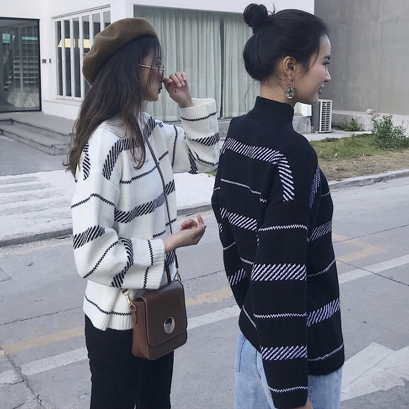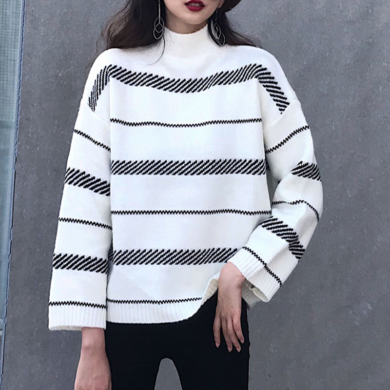 / 時尚條紋半高領毛衣女秋冬裝2018新款慵懶風寬松針織外套休閑上衣