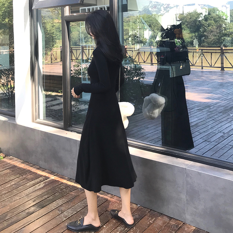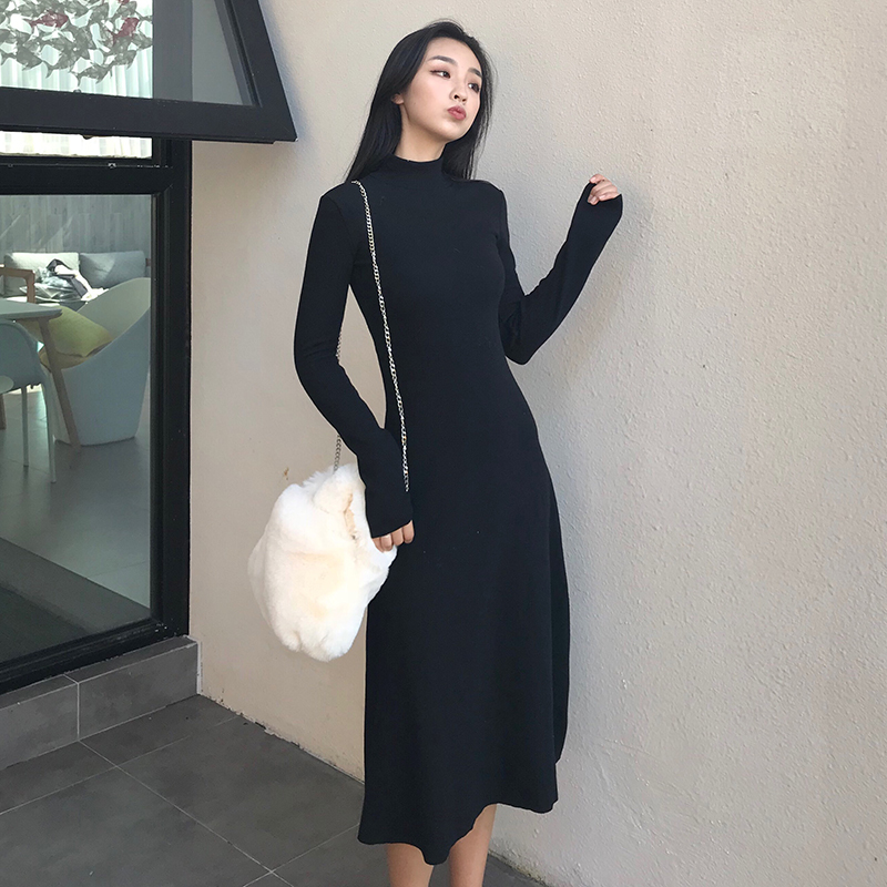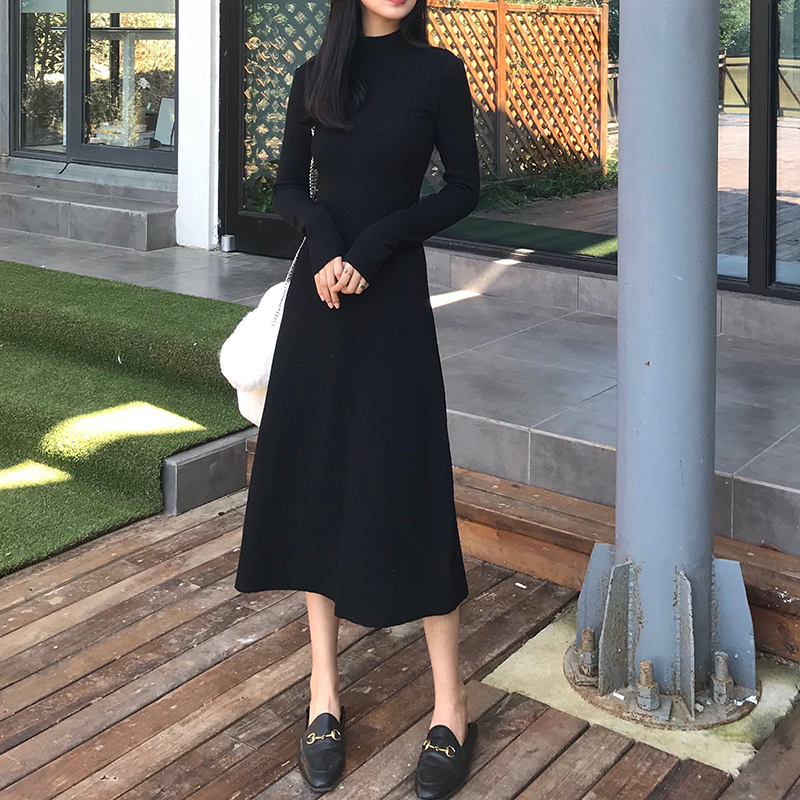 / 高冷范女裝小黑裙秋裝新款修身顯瘦小高領a字裙子氣質長袖連衣裙