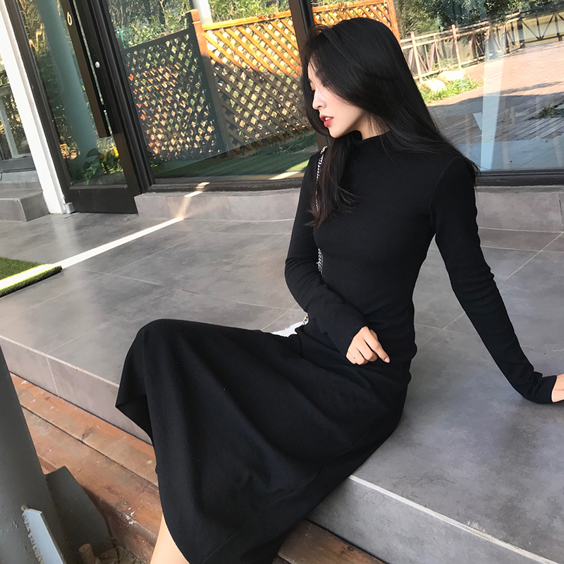 高冷范女裝小黑裙秋裝新款修身顯瘦小高領a字裙子氣質長袖連衣裙