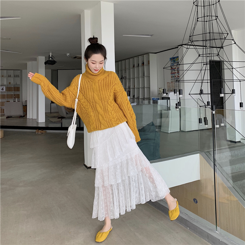 / 韓版新款chic女寬松高領麻花加厚針織毛衣甜美蕾絲蛋糕裙時尚套裝