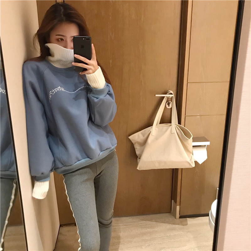 韓版假兩件毛呢料衛衣女秋冬2018新款套頭加厚寬松高領長袖上衣潮