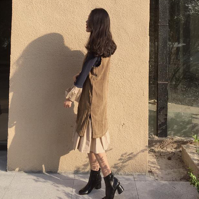/ 法式少女茶歇裙兩件套裝女秋冬燈芯絨背心喇叭長袖連衣裙蛋糕裙子