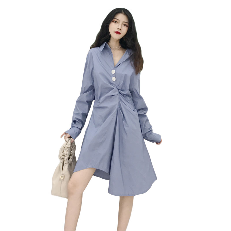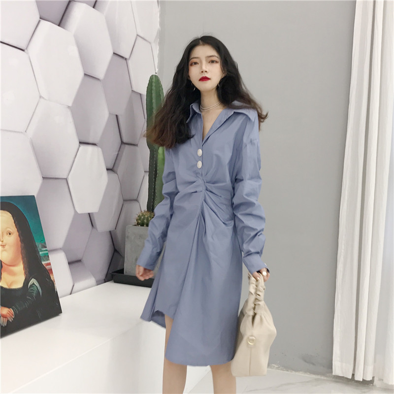 秋裝女2018新款時尚百搭韓版修身顯瘦長袖襯衣裙中長款皺褶連衣裙