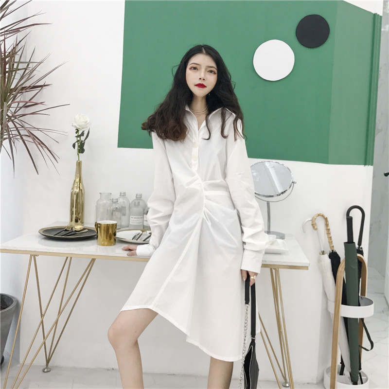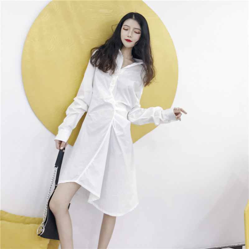 港味時尚秋裝女2018新款長袖白襯衫裙氣質百搭收腰修身顯瘦連衣裙