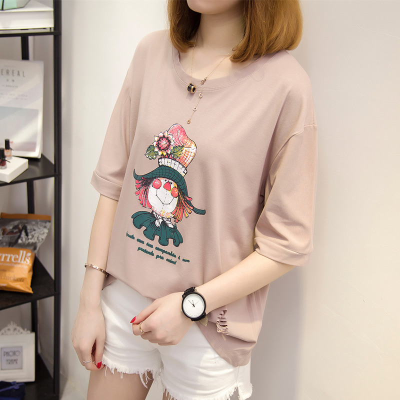 短袖t恤女夏季新款韓版寬松破洞印花打底體恤衫百搭上衣女潮