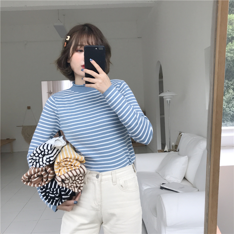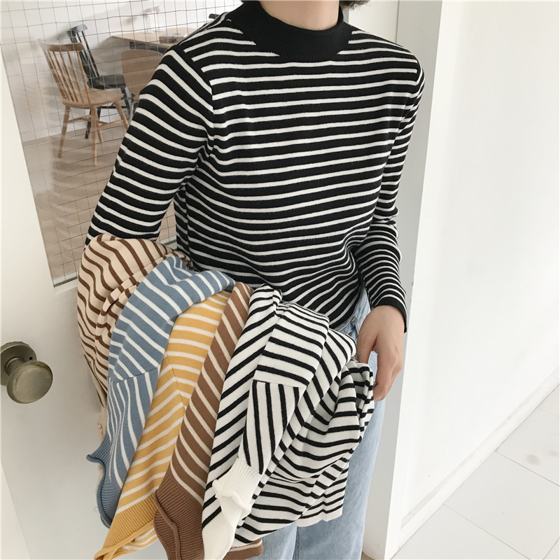 / 秋冬韓版學院風條紋修身顯瘦網紅套頭長袖針織衫打底衫毛衣上衣女