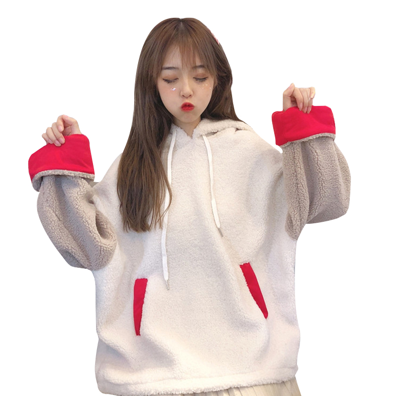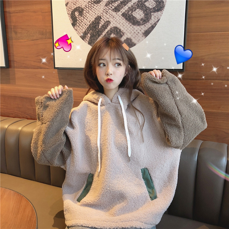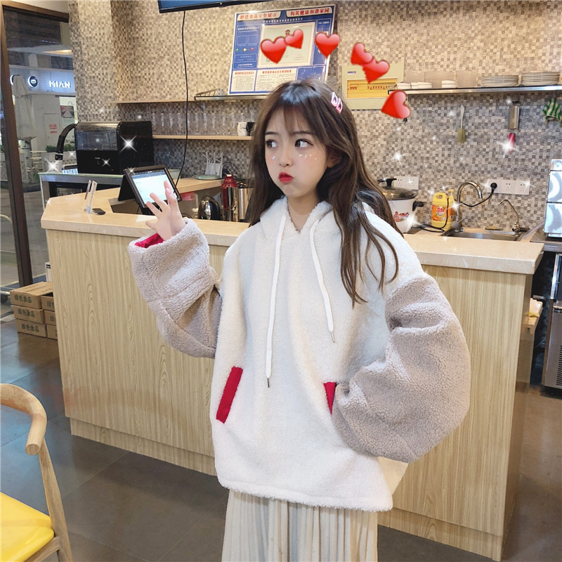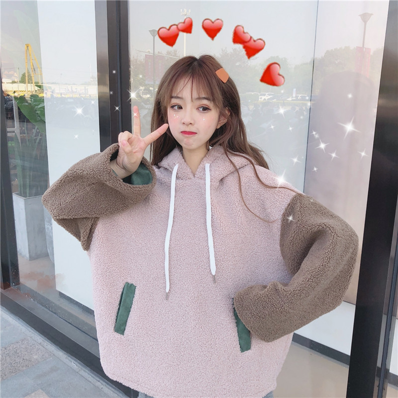 秋冬女裝韓版復古寬松撞色拼接仿羊羔毛連帽加厚套頭衛衣上衣外套