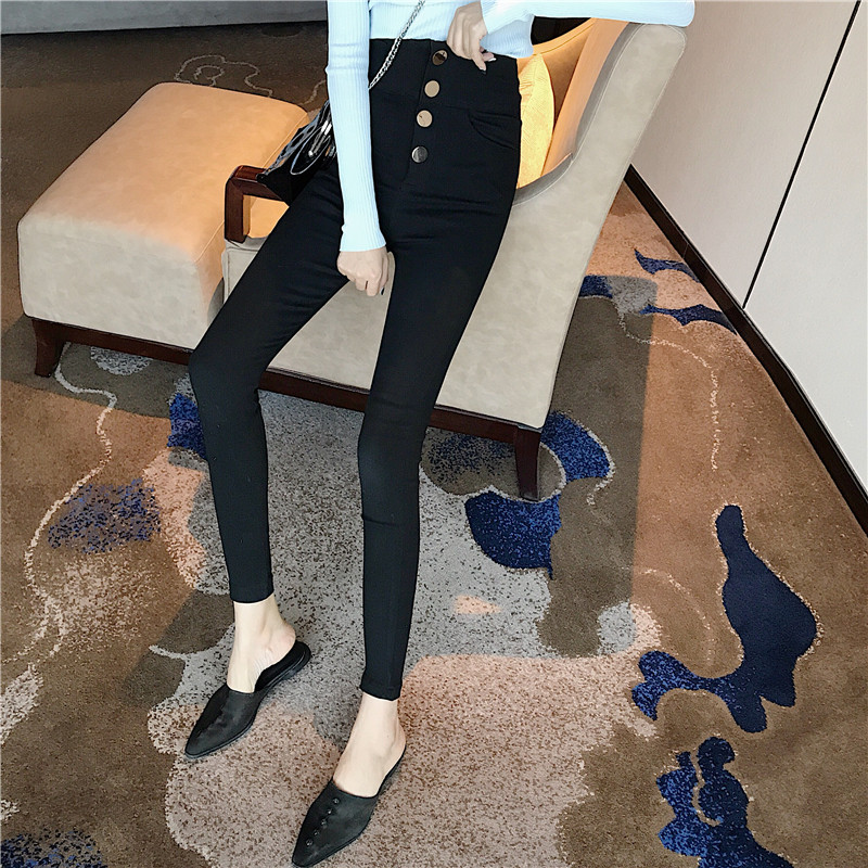 韓版女褲秋季2018新款春秋百搭高腰單排扣彈力修身鉛筆小腳休閑褲