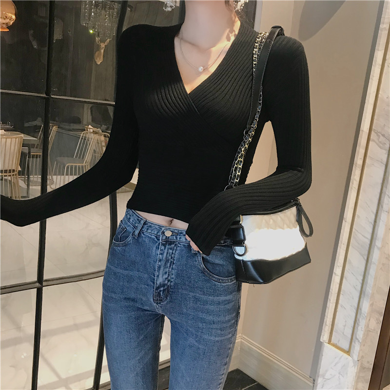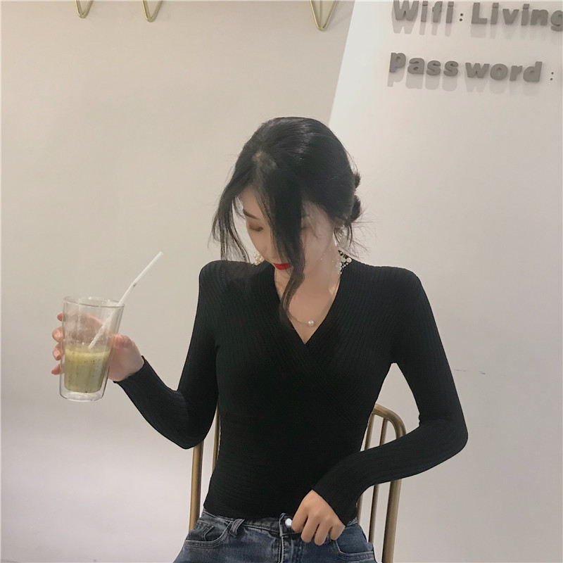 / 2018新款chic早秋上衣女深V領韓版百搭T恤時尚針織緊身顯瘦打底衫