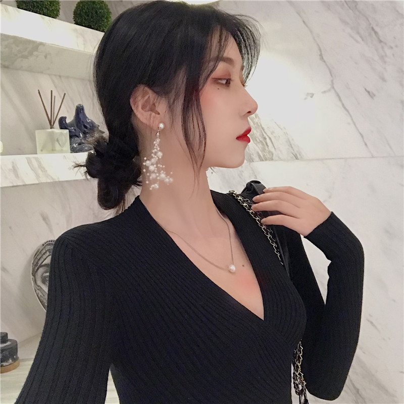 2018新款chic早秋上衣女深V領韓版百搭T恤時尚針織緊身顯瘦打底衫