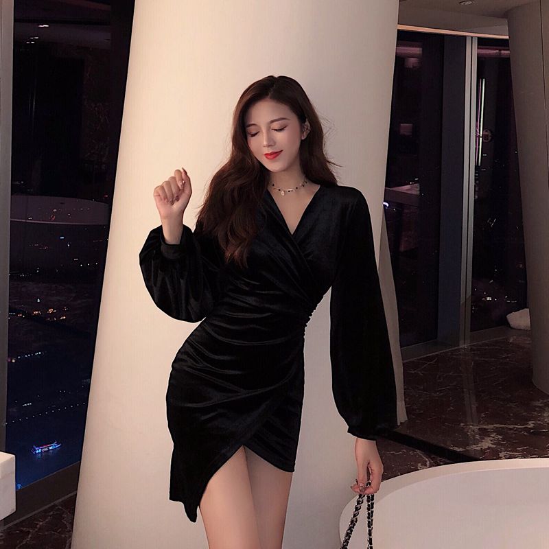 / 秋冬新款港味性感長袖百搭復古短裙顯瘦V領絲絨不規則包臀連衣裙