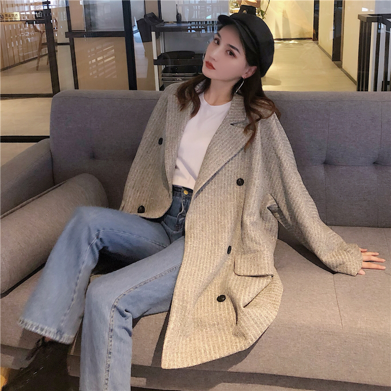 / 時尚小香風新款韓版復古chic秋季簡約雙排扣毛呢寬松氣質大衣外套