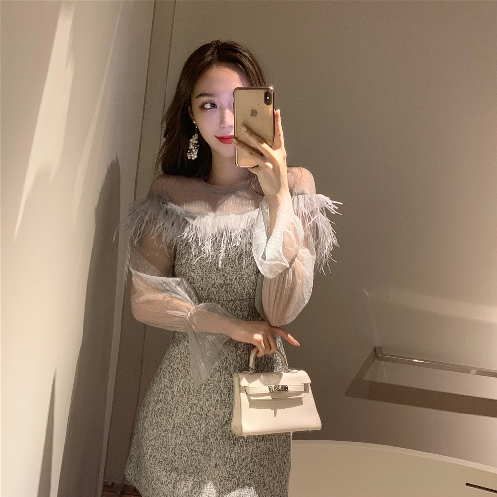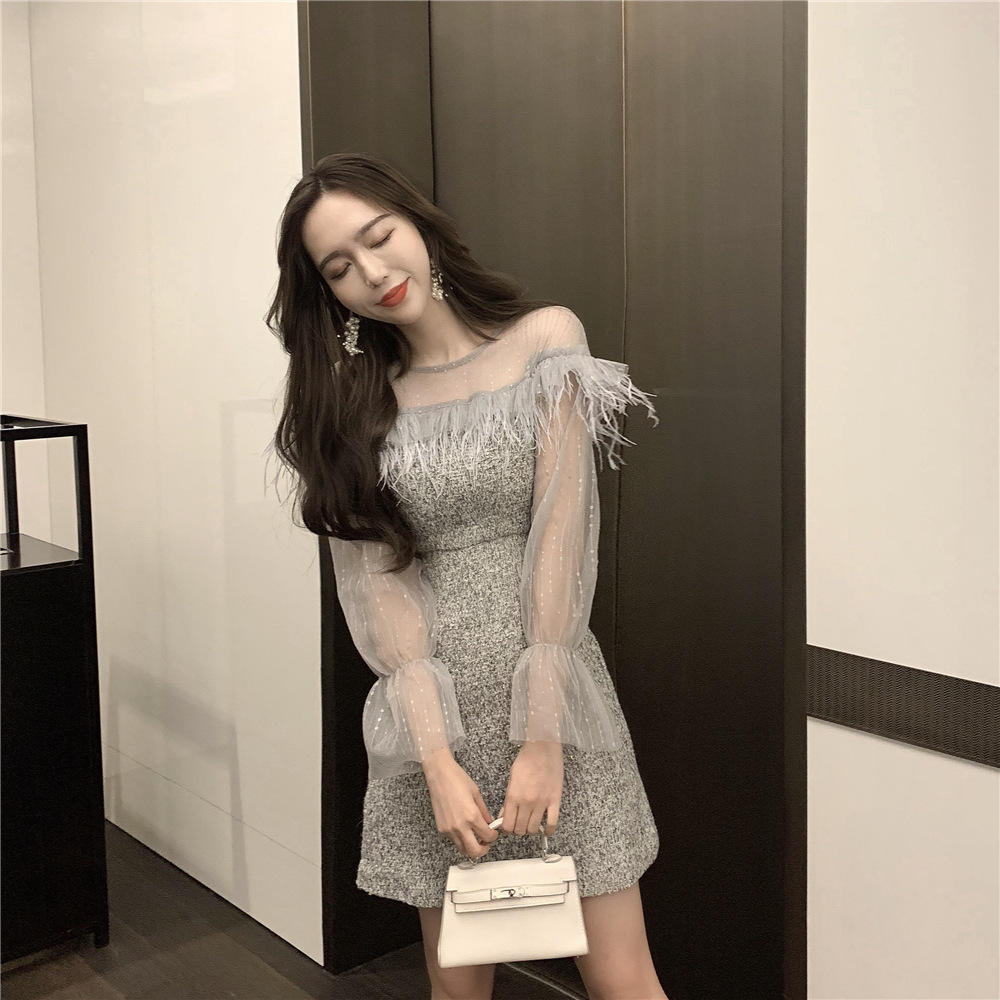 / 名媛氣質秋冬新款女裝高腰羽毛流蘇高貴網紗拼接A字連衣裙半身裙