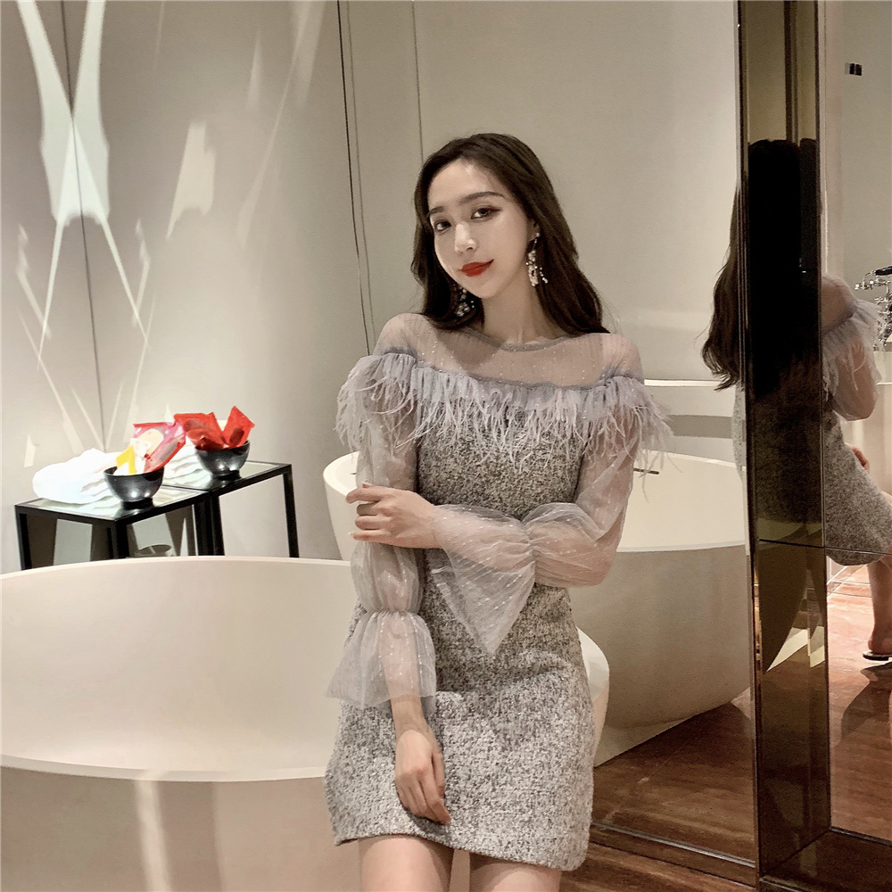 名媛氣質秋冬新款女裝高腰羽毛流蘇高貴網紗拼接A字連衣裙半身裙