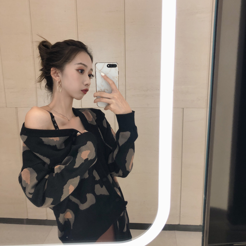 毛衣女2018新款豹紋套頭針織衫慵懶風寬松oversize中長款毛衣女潮