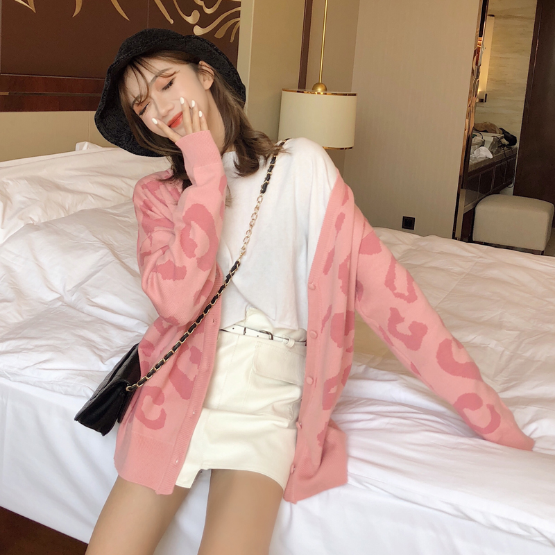 毛衣女2018新款復古慵懶風寬松撞色豹紋針織開衫長袖中長款外套潮