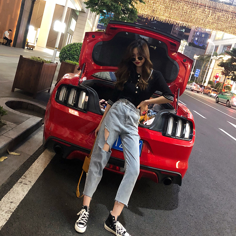 大破洞毛邊乞丐褲女學生早秋新款顯瘦高腰百搭破爛九分直筒牛仔褲