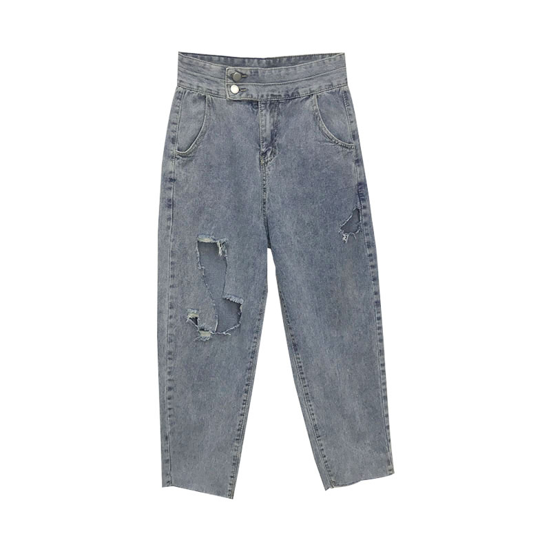 / 大破洞毛邊乞丐褲女學生早秋新款顯瘦高腰百搭破爛九分直筒牛仔褲