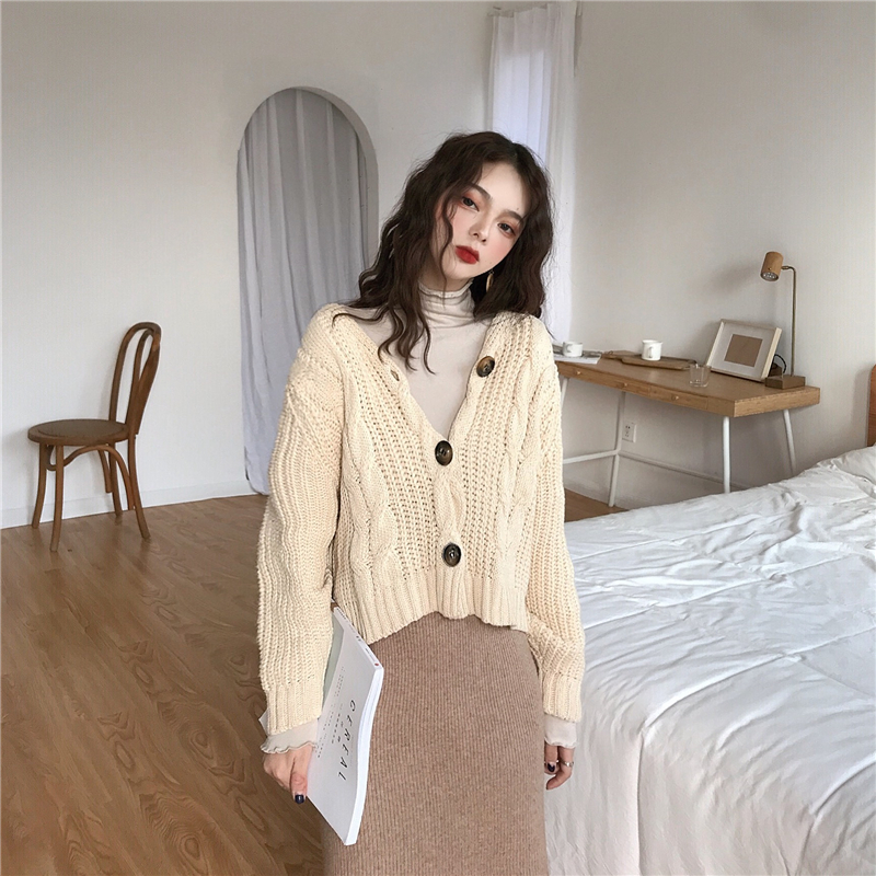 / 時尚慵懶復古針織麻花開衫+百搭高領打底+中長款包臀針織裙三件套
