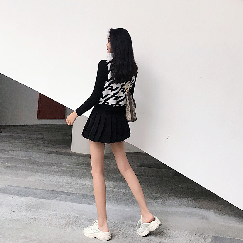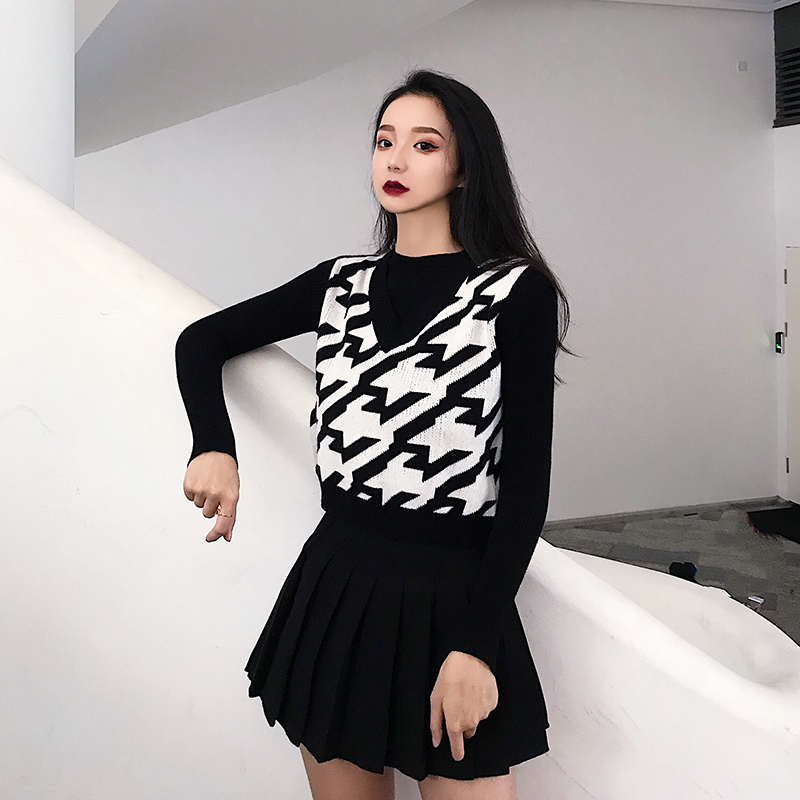 / 韓版時尚百搭寬松馬甲背心+簡約純色針織打底衫+高腰百褶裙三件套