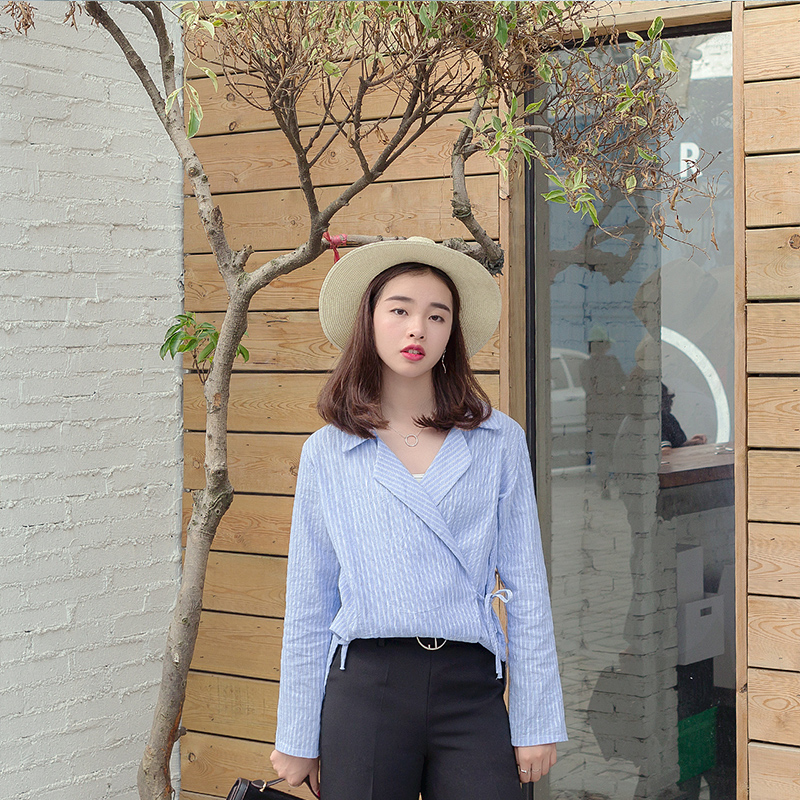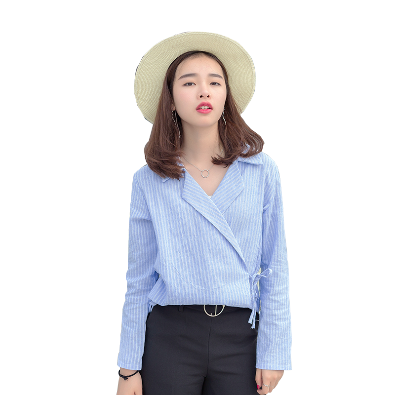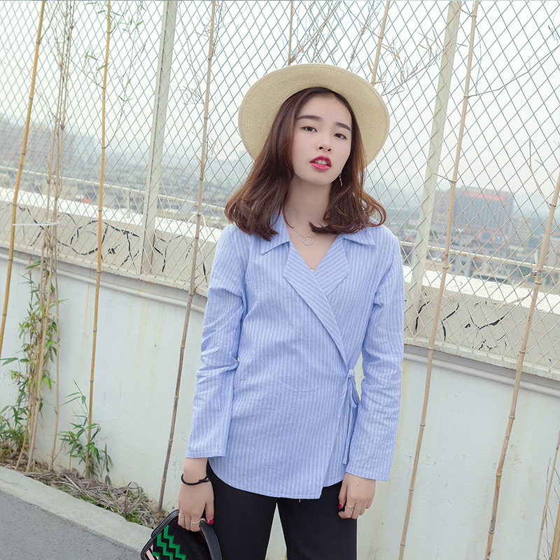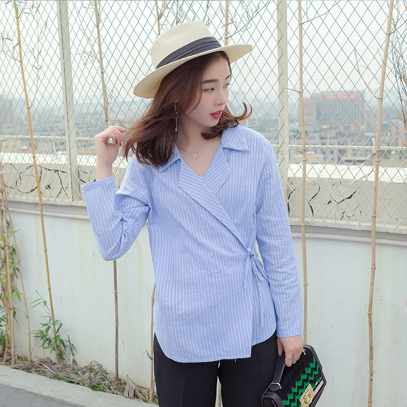 / 春裝女裝新款韓版豎條紋V領襯衫腰部系帶顯瘦襯衣學生上衣潮