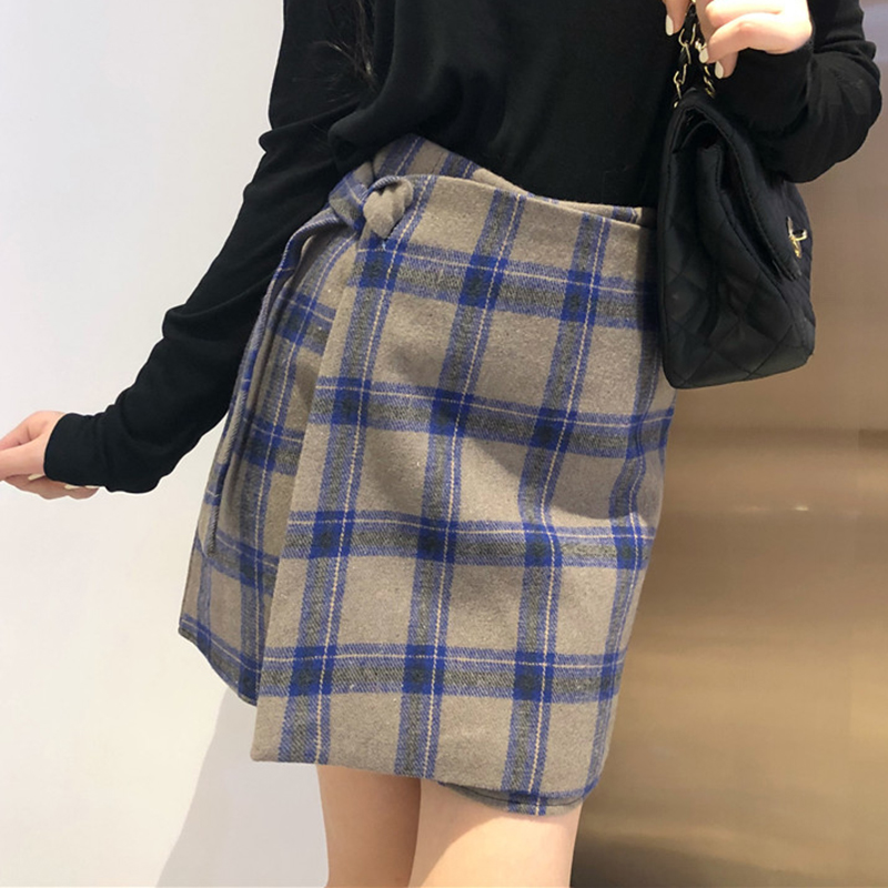 / 秋冬女裝2018新款韓版高腰顯瘦毛呢A字短裙系帶復古風格子半身裙
