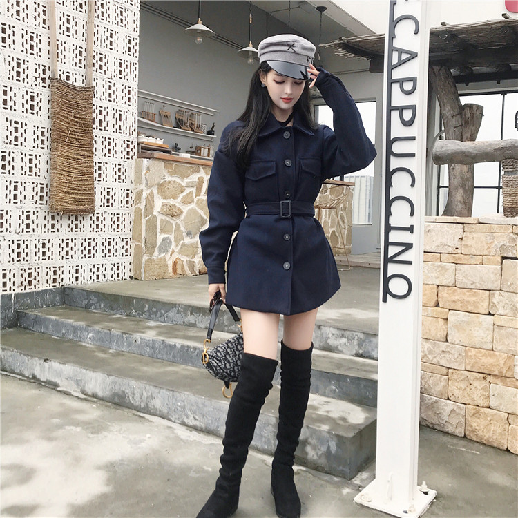 外套女春秋2018新款時尚chic簡約寬松顯瘦中長款呢子外套女配腰帶