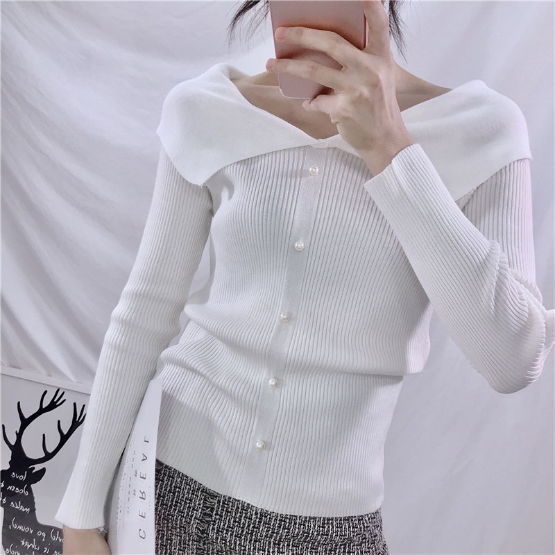 / 秋季新款修身娃娃領針織打底衫女裝韓版顯瘦黑色套頭毛衣長袖上衣