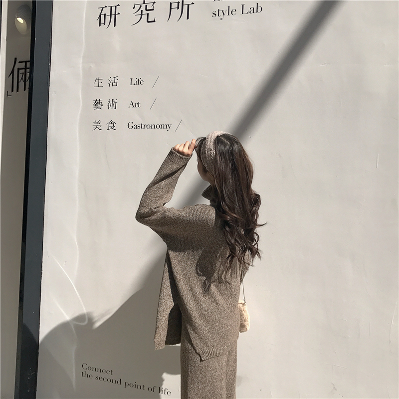 / 復古慵懶寬松加厚保暖高領毛衣高腰顯瘦針織闊腿褲時尚套裝兩件套