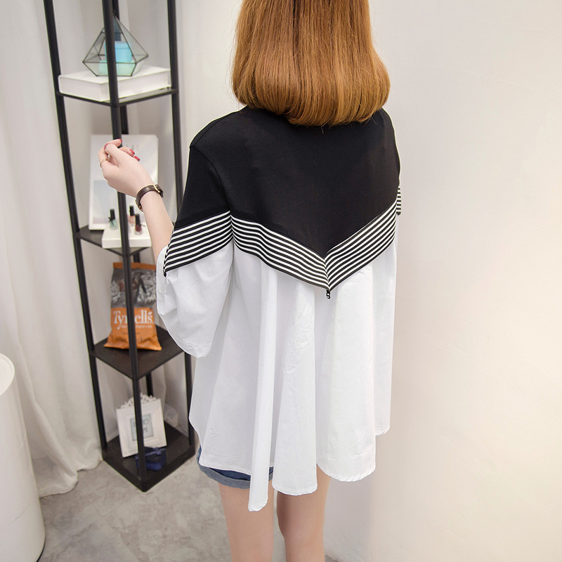 / 夏季衣服女裝韓版寬松拼接打底體恤衫新款春裝百搭中長袖上衣