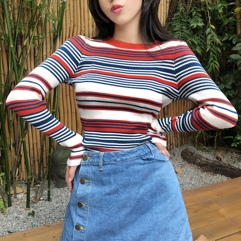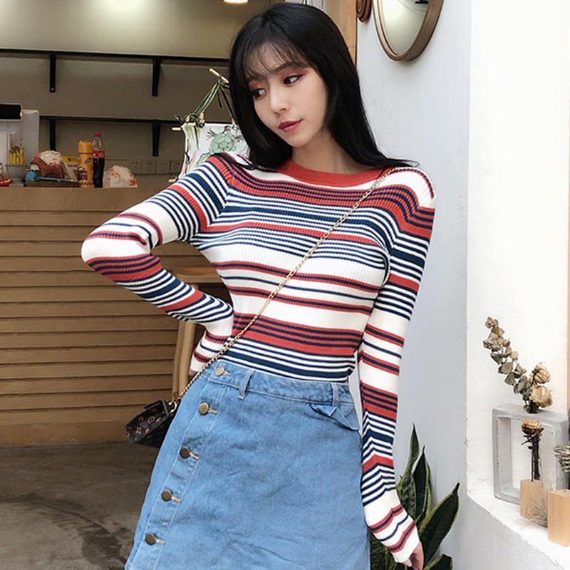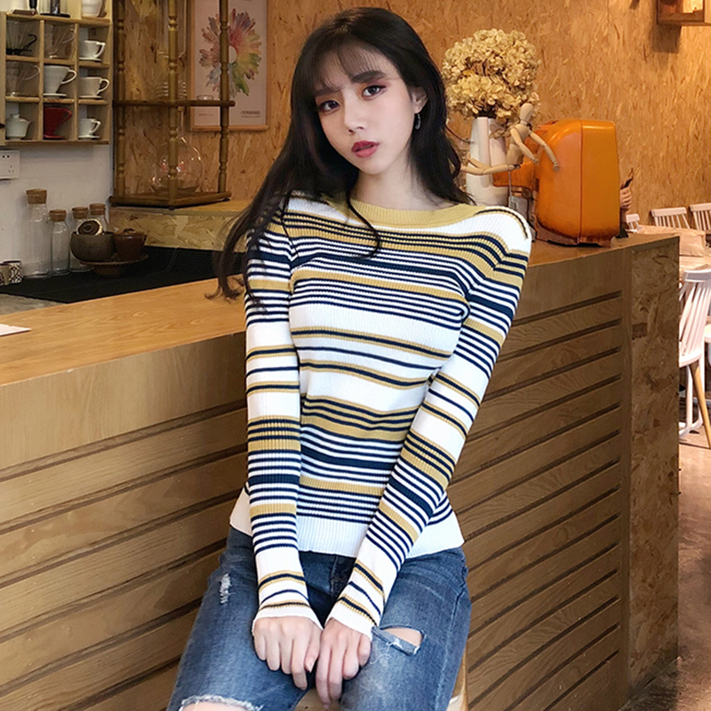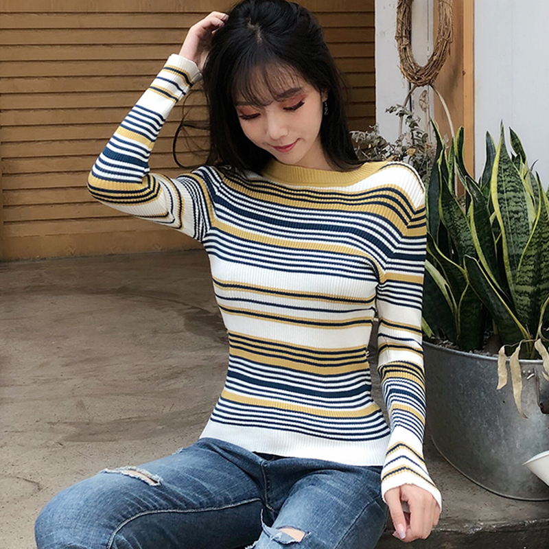 氣質修身外穿打底毛衣女秋冬裝2018新款chic風撞色條紋長袖針織衫