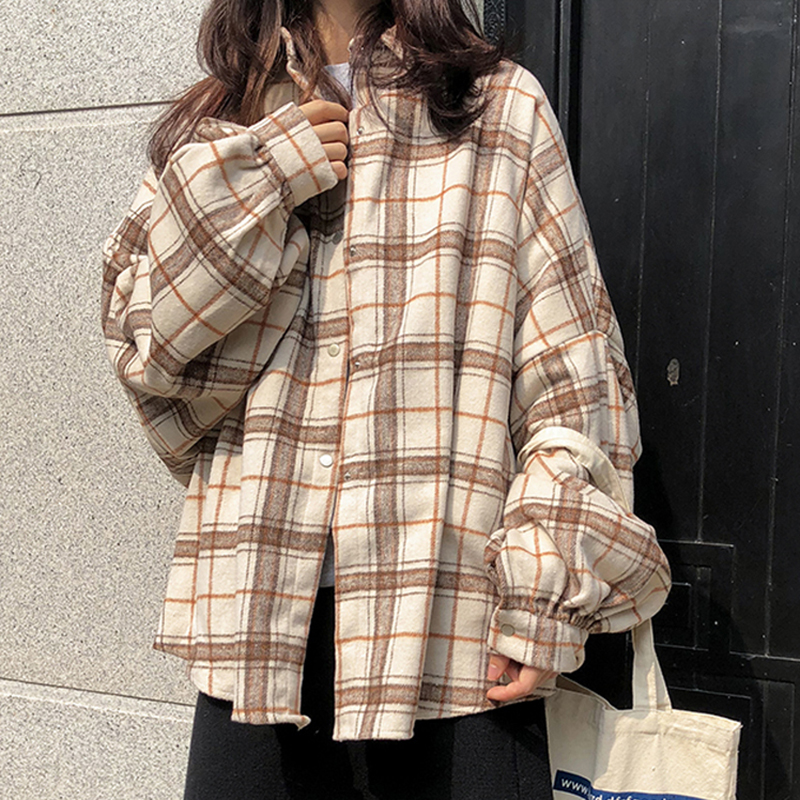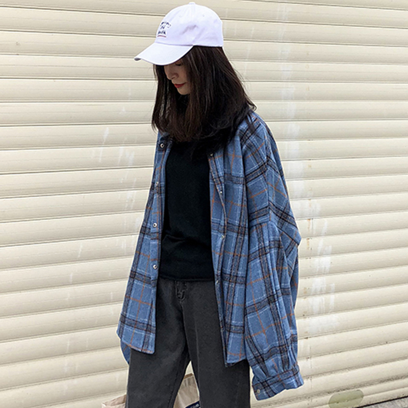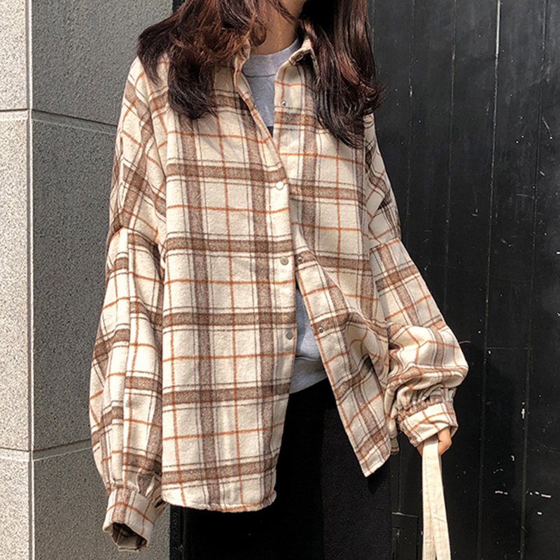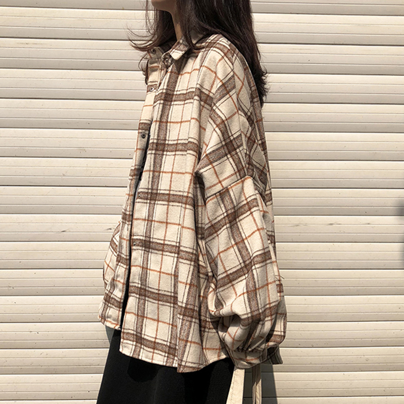 復古chic格子襯衣女秋冬裝2018新款學生寬松翻領燈籠長袖襯衫外套