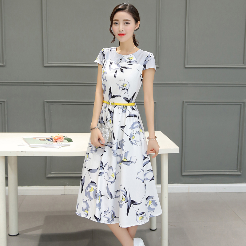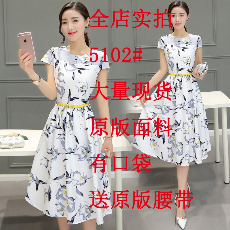 / 實拍新款韓版淑女修身顯瘦a字裙子時尚印花短袖中長款連衣裙女裝