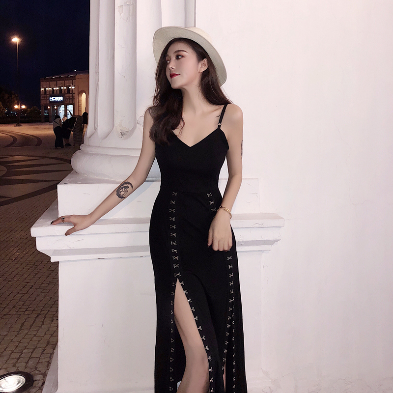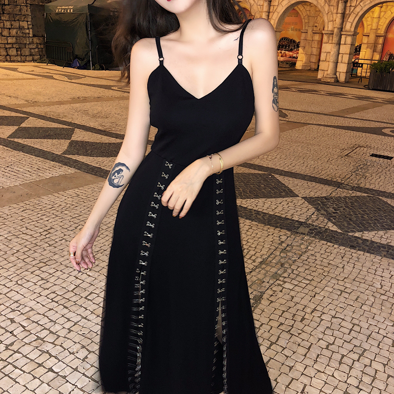 V領露背金屬扣高腰復古chic新款開叉設計感小心機時尚百搭連衣裙
