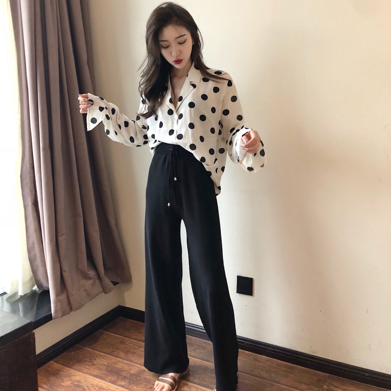 / 秋季新款雪紡長袖百搭襯衫顯瘦打底衫高腰休閑針織長褲時尚套裝女