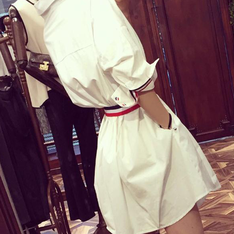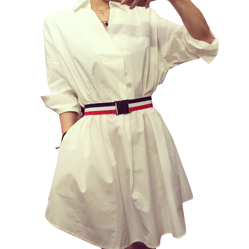 / 春裝新款女裝韓版時尚闊擺白色襯衫連衣裙女寬松顯瘦襯衣原配腰帶