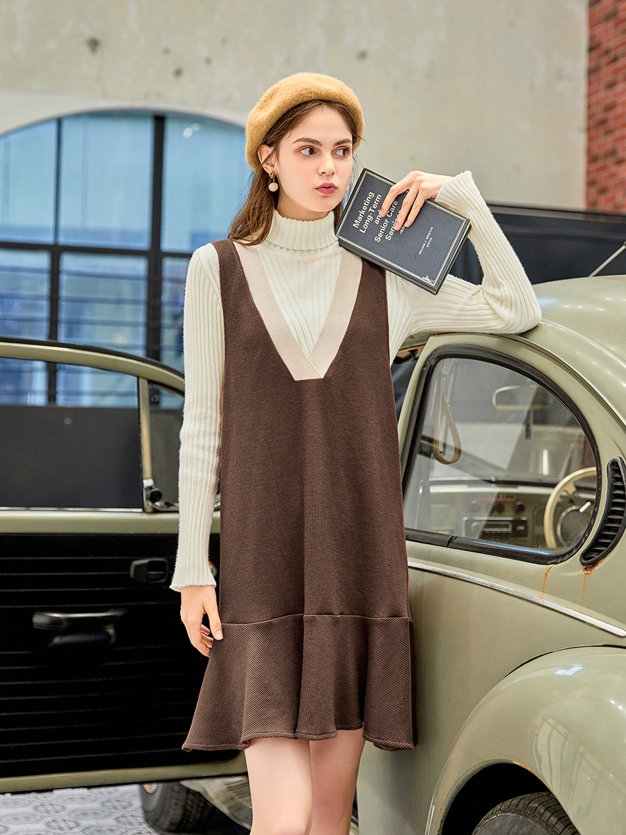 MG小象V領連衣裙女秋冬2018新款港味復古chic針織裙子無袖背心裙