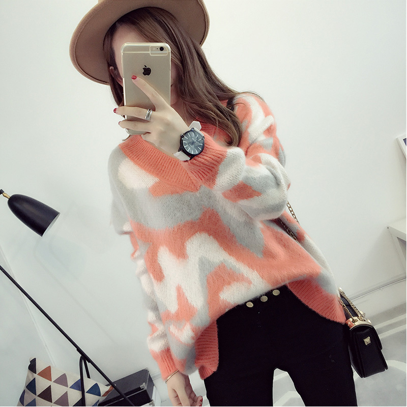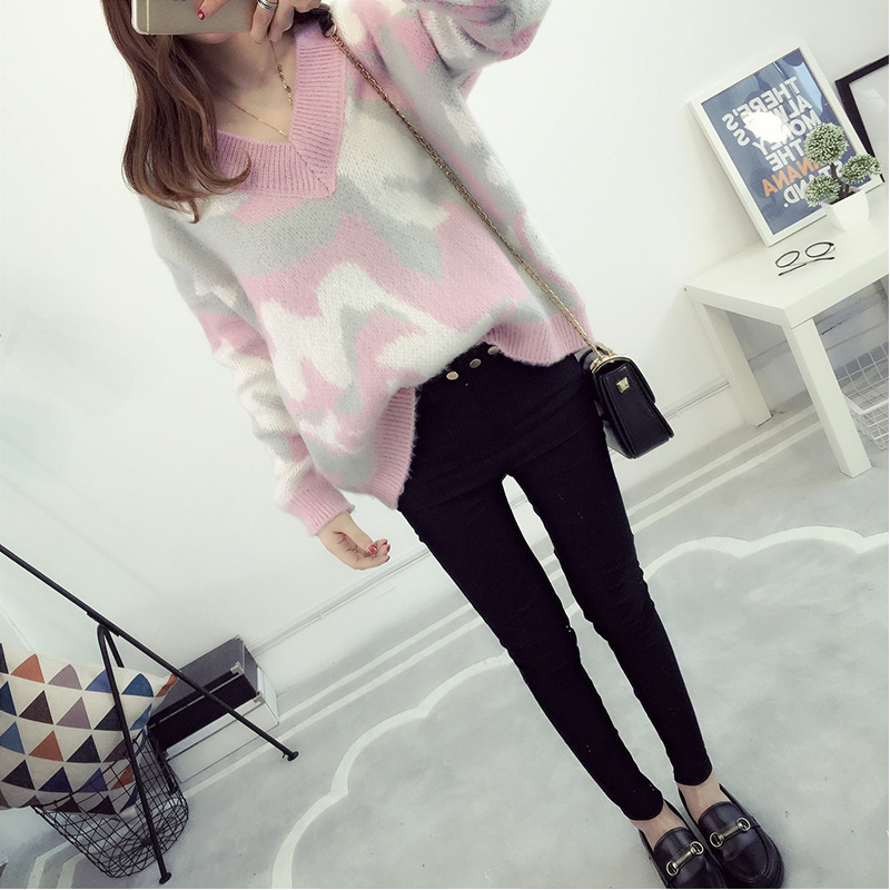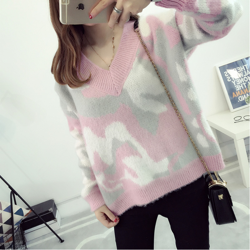 套頭毛衣女寬松韓版短款V領針織衫迷彩外套秋冬裝女裝新款潮