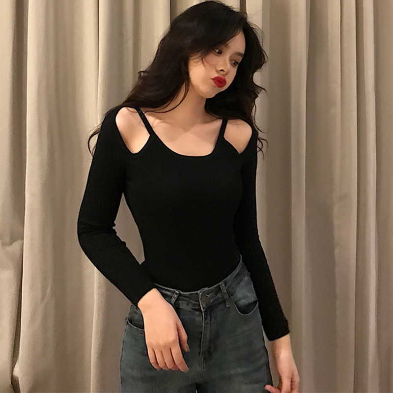 / 氣質露肩修身顯瘦打底針織衫女秋冬裝新款黑色長袖短款T恤上衣潮