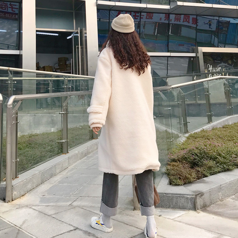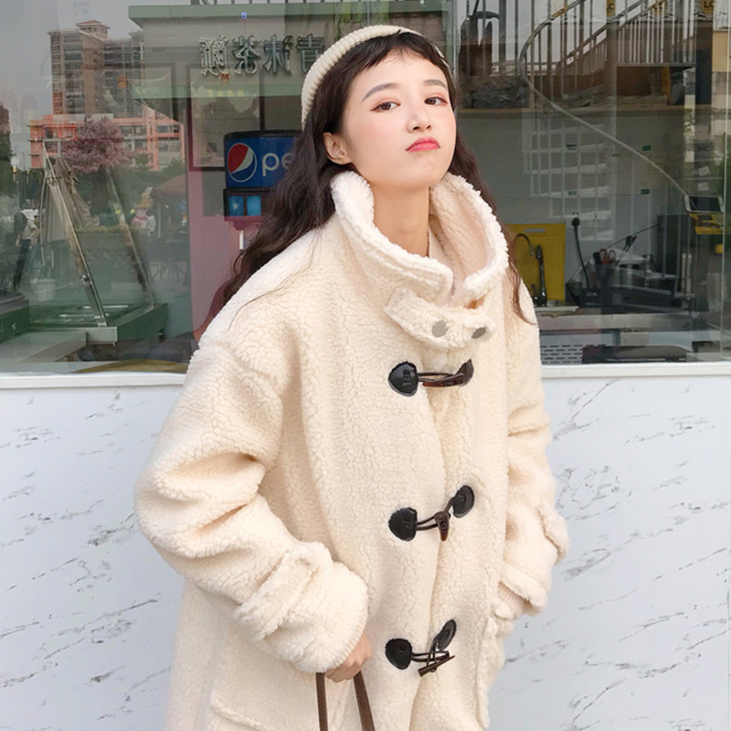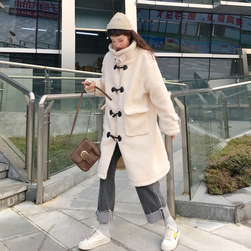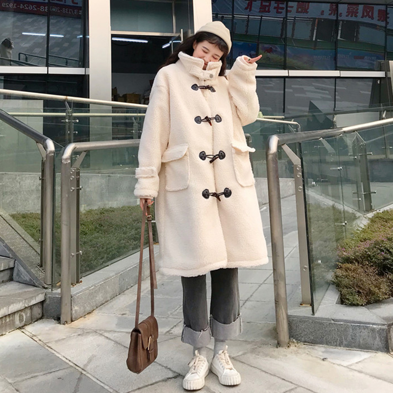 / 韓版寬松中長款牛角扣羊羔毛上衣秋冬新款女裝矮個子保暖棉衣外套