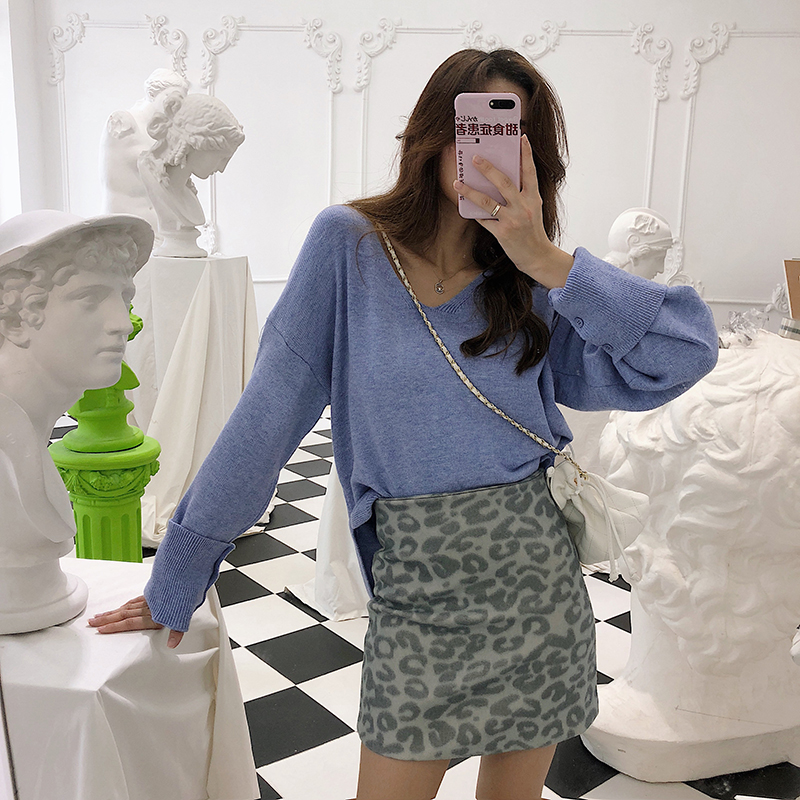 慵懶V領寬松套頭針織網紅毛衣女2018新款+高腰短裙豹紋包臀半身裙