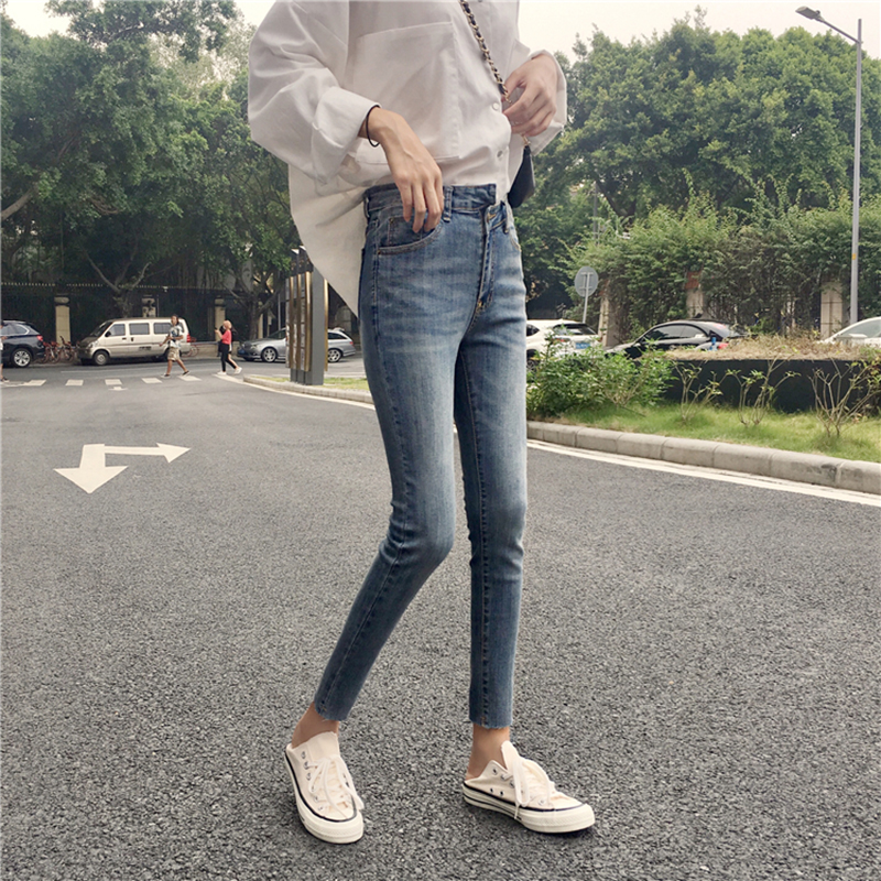 / 不規則高腰顯瘦小腳鉛筆褲子秋裝女2018新款學生牛仔褲休閑九分褲
