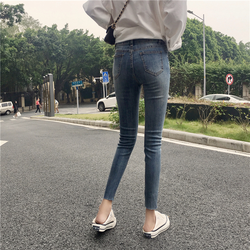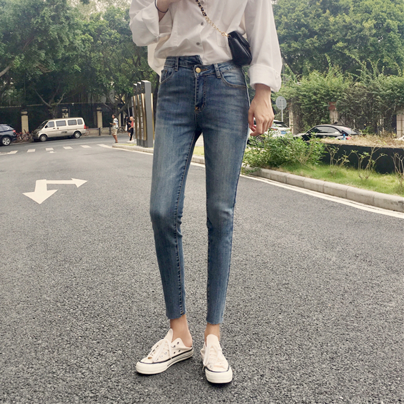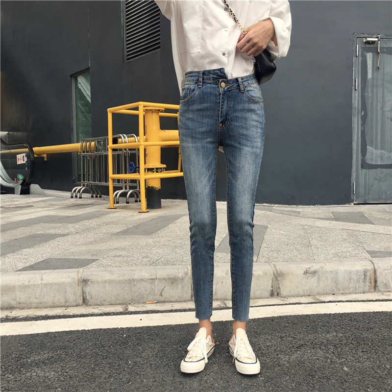 不規則高腰顯瘦小腳鉛筆褲子秋裝女2018新款學生牛仔褲休閑九分褲