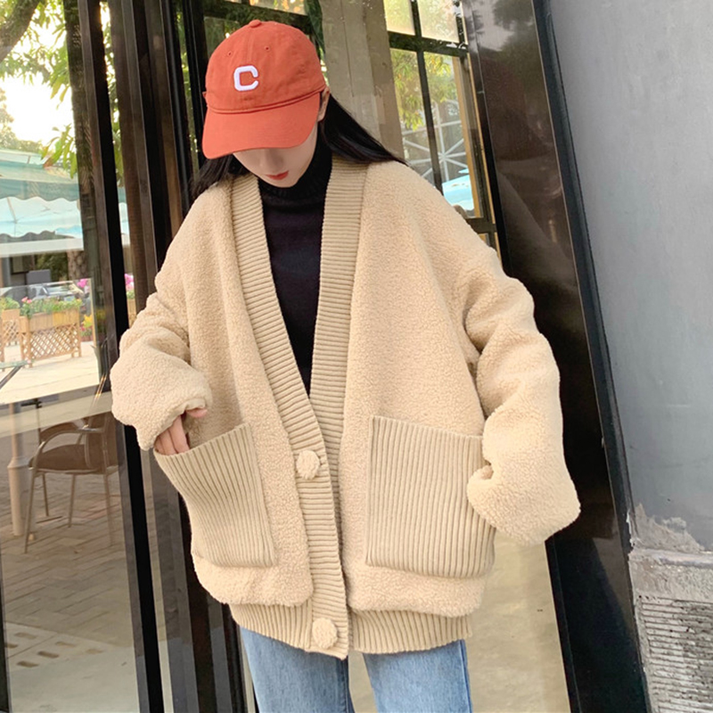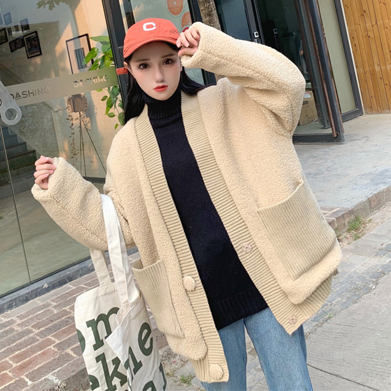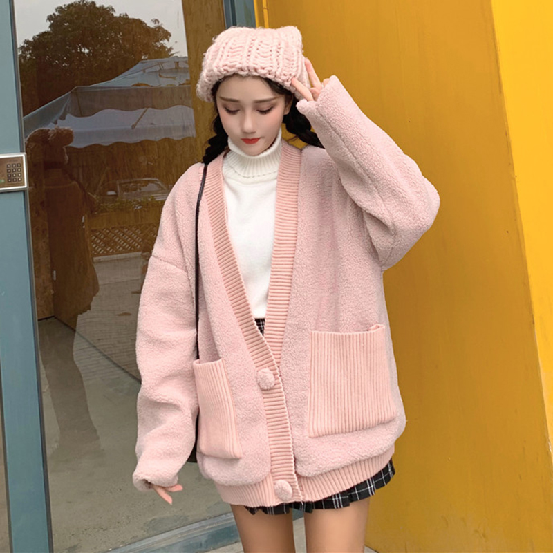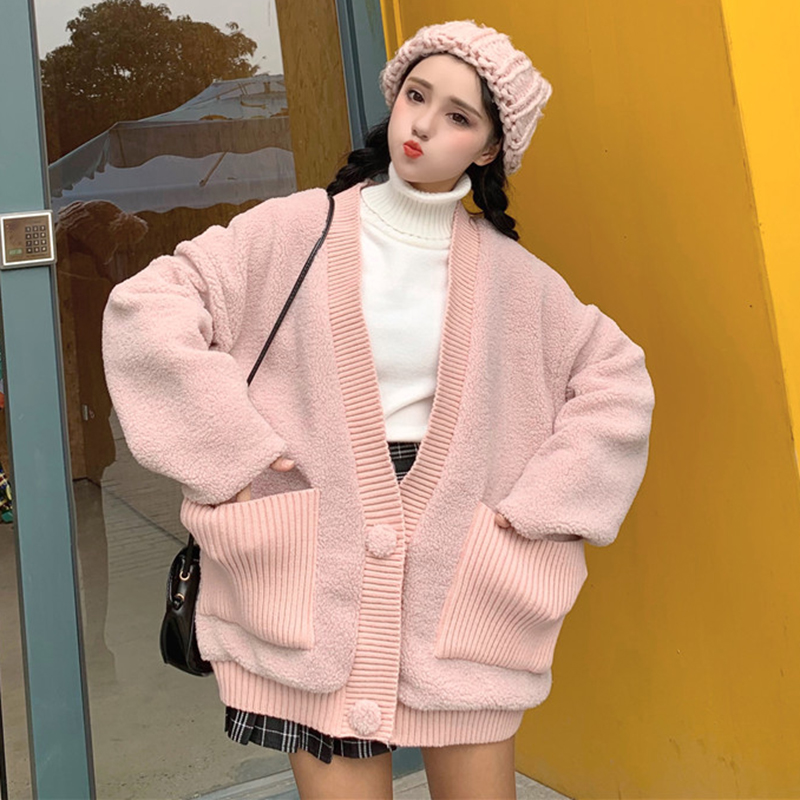 / 慵懶風寬松加厚雙層羊羔毛開衫秋冬女裝新款韓版休閑粉色外套上衣