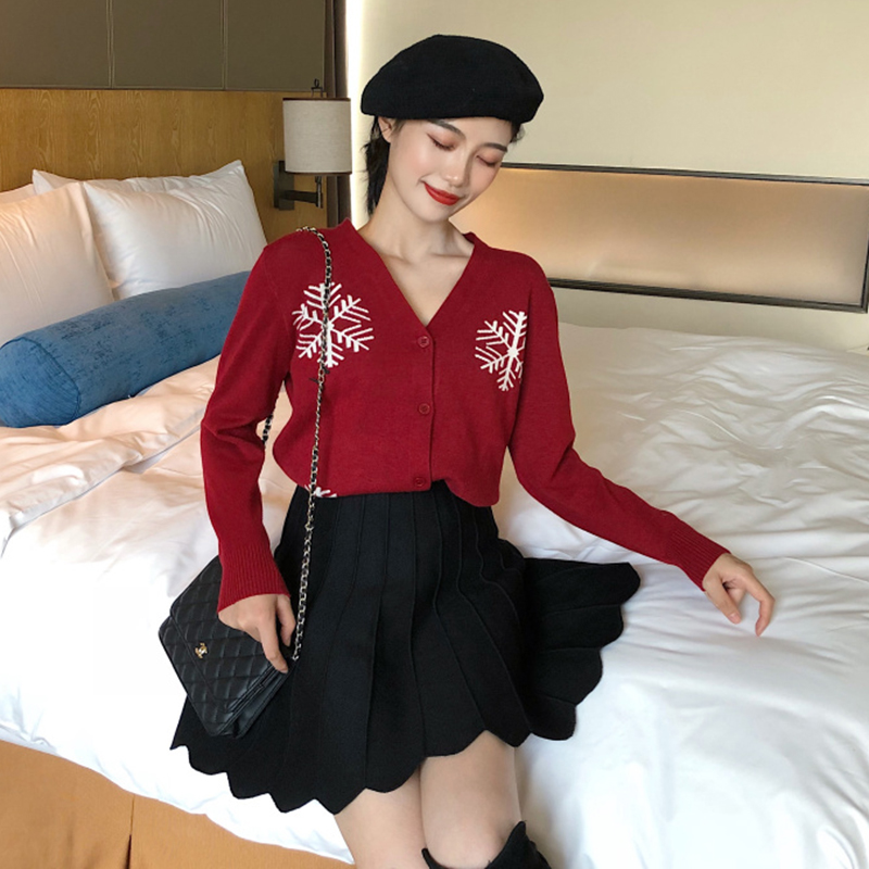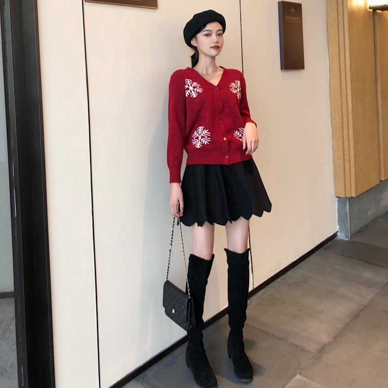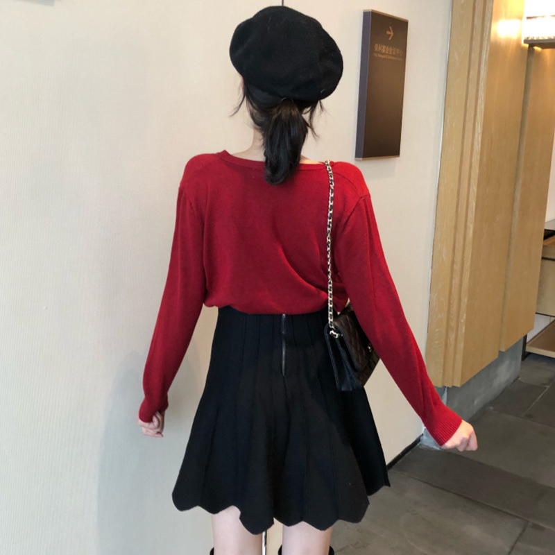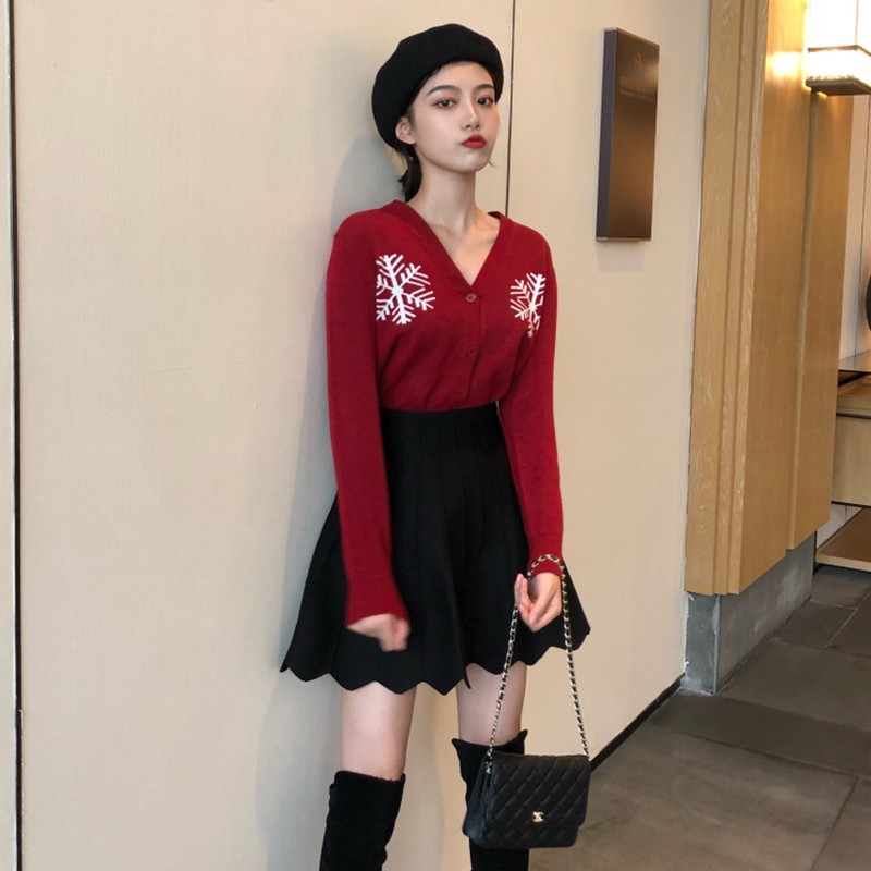/ 毛衣配裙子兩件套秋冬裝新款修身V領針織開衫高腰A字百褶半身裙子